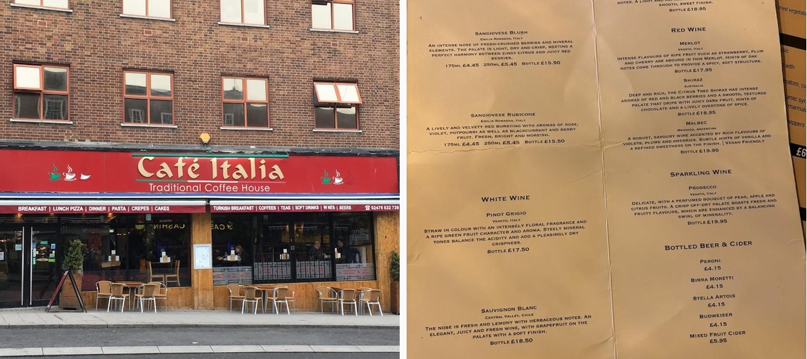 Cafe Italia is a charming, family-run establishment in Coventry, established in 2010. It offers a delightful blend of Italian and British cuisine, perfect for any meal of the day. The menu boasts a remarkable selection, from mouthwatering pastas and pizzas to hearty breakfasts and decadent desserts. It's a go-to spot for coffee lovers, featuring a unique coffee blend along with various teas. The pricing, generally between £10–20, keeps it accessible without compromising quality. Whether you're there for a casual breakfast or a cozy dinner, the inviting atmosphere and friendly service make each visit memorable.